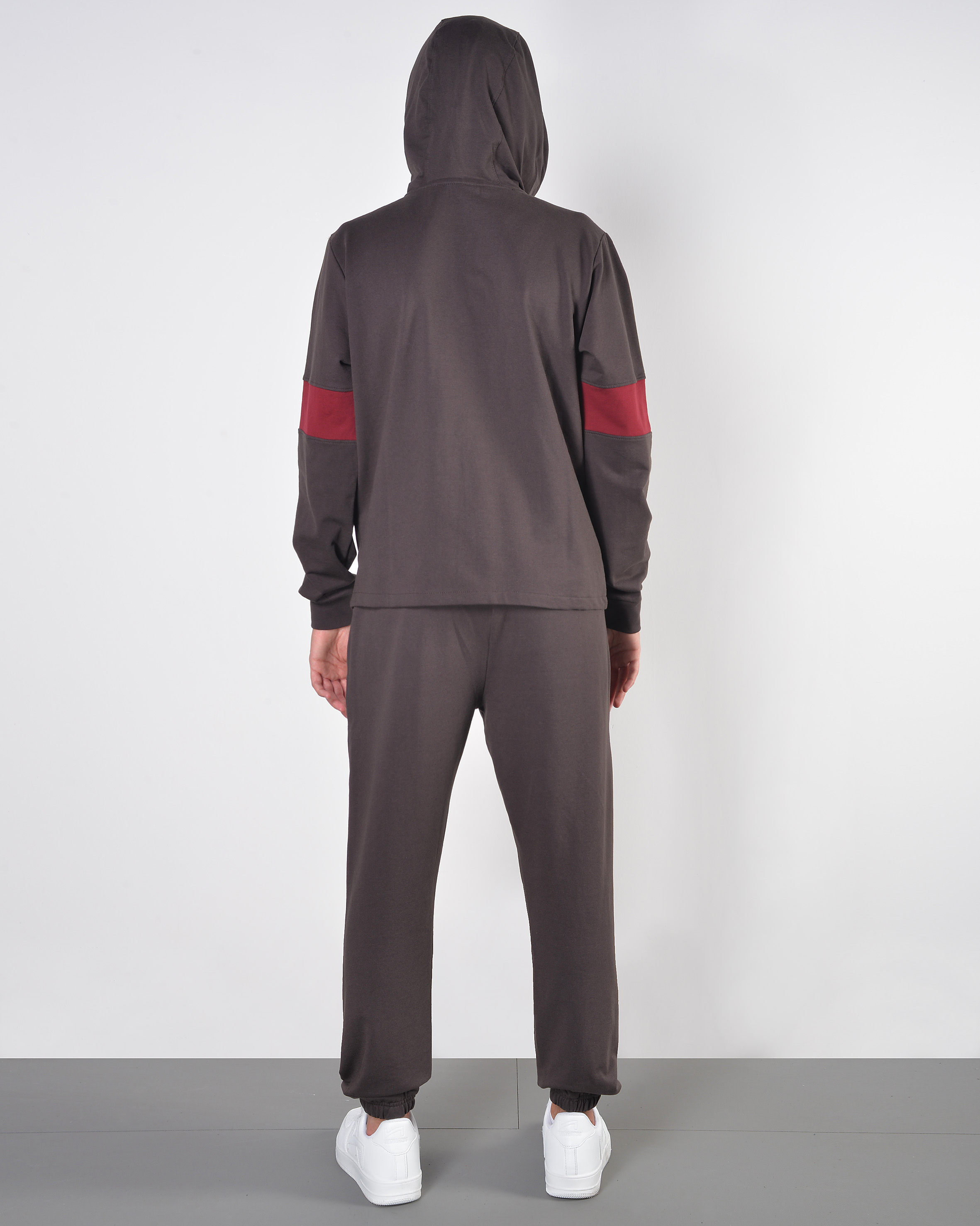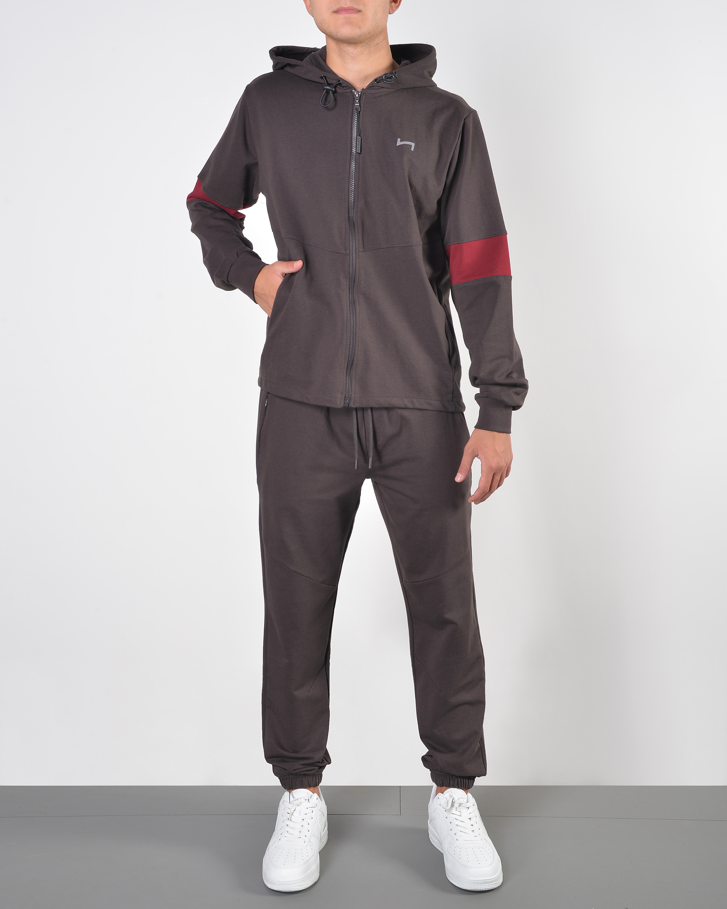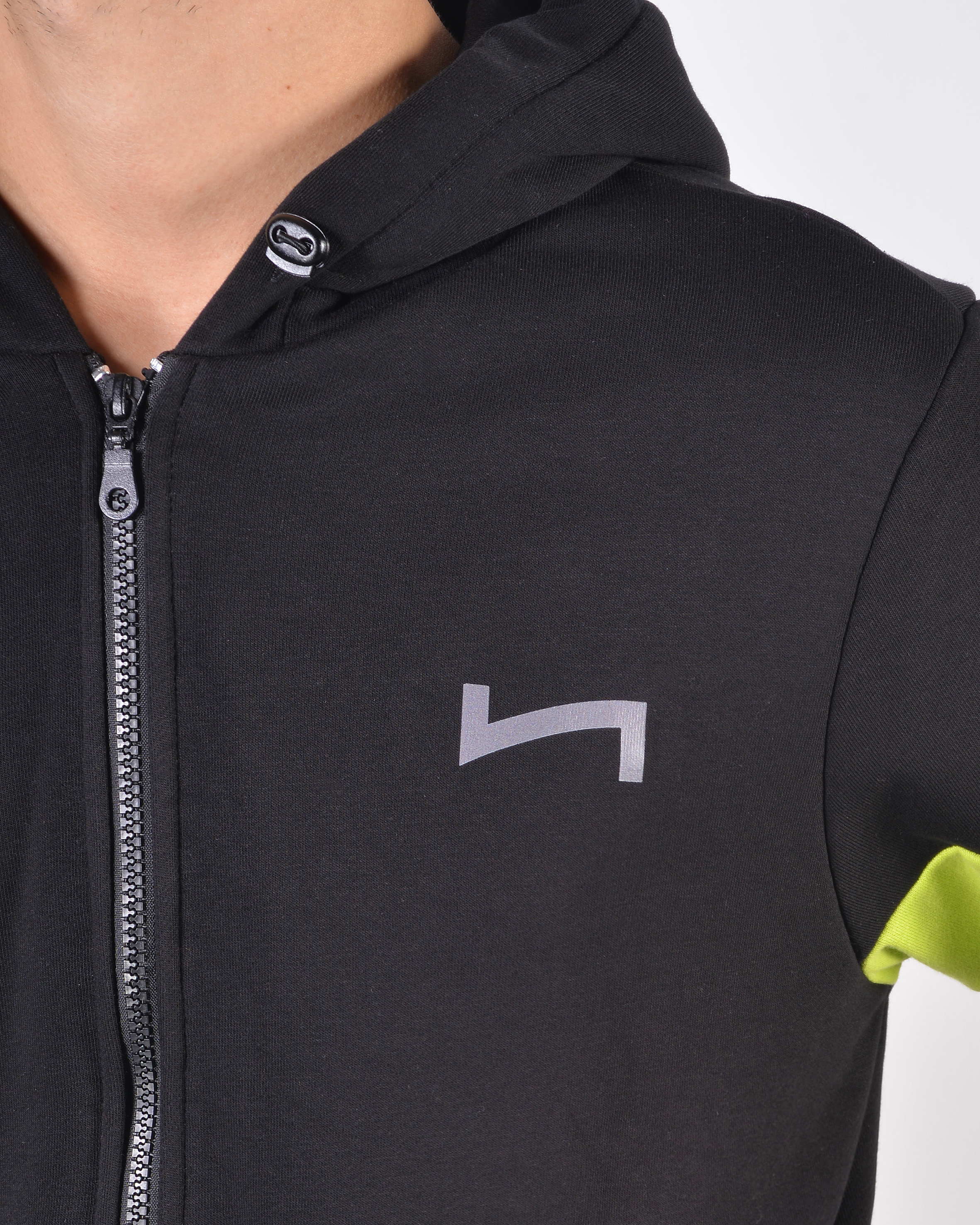 - felpa zip con cappuccio ed inserti alle mancihe a contrasto;